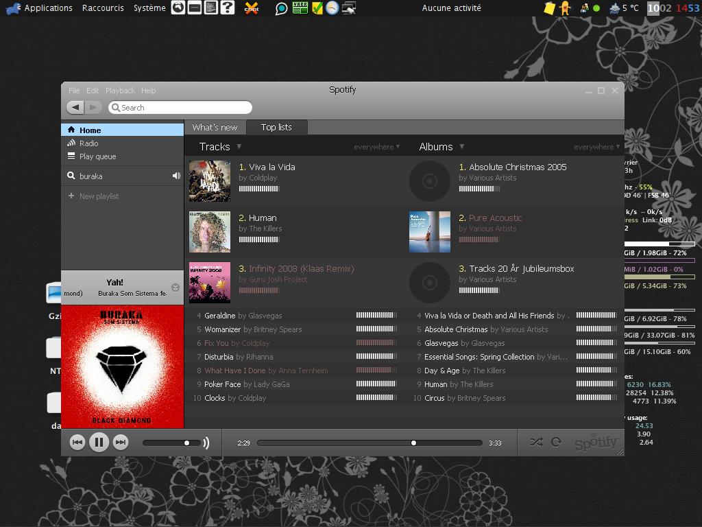 L’interface globale, l’accueil avec les propositions d’écoute et une recherche de « buraka » pour écouter Buraka Som Sistema: